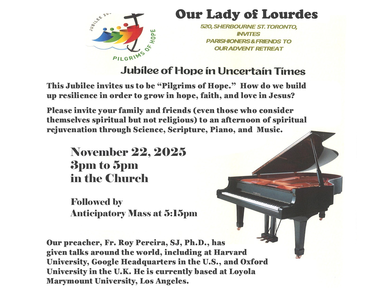 Please invite your family and friends (even those who consider themselves spiritual but not religious) to an afternoon of spiritual rejuvenation through Science, Scripture, Piano, and Music. Our preacher, Fr. Roy Pereira, SJ, Ph.D., has given talks around the world, including at Harvard University, Google Headquarters in the U.S., and Oxford University in the U.K. He is currently based at Loyola Marymount University, Los Angeles.